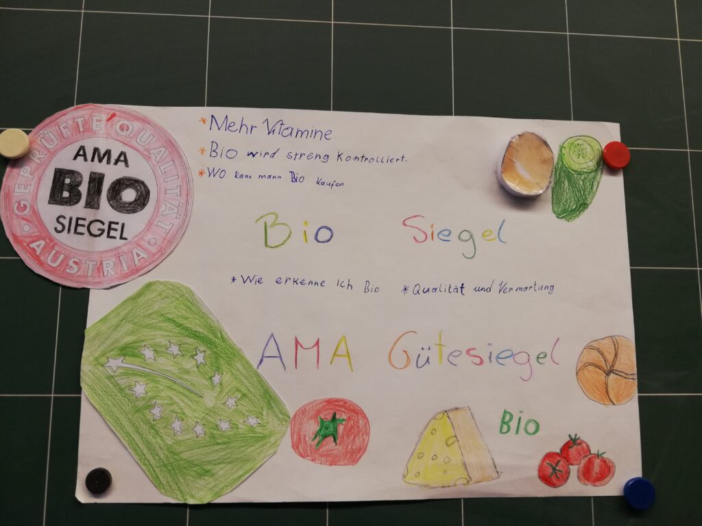 Im Zuge der AMA Bio-Volksschulaktion, setzten sich die Schülerinnen und Schüler der 4a Klasse mit den Themen der Nachhaltigkeit, biologischer Landwirtschaft und dem AMA Gütesiegel auseinander. In Kleingruppen recherchierten sie und gestalteten Plakate, die sie dann präsentierten. Abschließend machten wir noch gemeinsam einen Obstsalat aus biologischem, regionalem und saisonalem Obst.